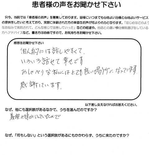 個人的には話しやすくて色々話せて幸せです。おしゃべりな私にはとても良い場所になっています。感謝しています。