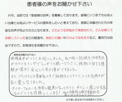 眼精疲労が辛くお伺いしました。私の拙い説明を池田先生がカウンセリングでしっかりと聞いてくださり、施術に対する理解が深まり安心して受けることができました。また、リラックスした雰囲気の中で施術をして下さり、とても気持ちが良く楽になりました。アフターフォローも非常に親身になってくださり、優しい感じの先生なのでとても信頼しています!他の治療院のような業務的な感じはしませんでした!