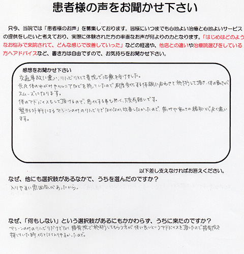 マシンのみのリハビリだけではなく接骨院で施術してもらう方が体に良いというアドバイスをいただいたので、接骨院を探していた時、何となく入りやすかったので。