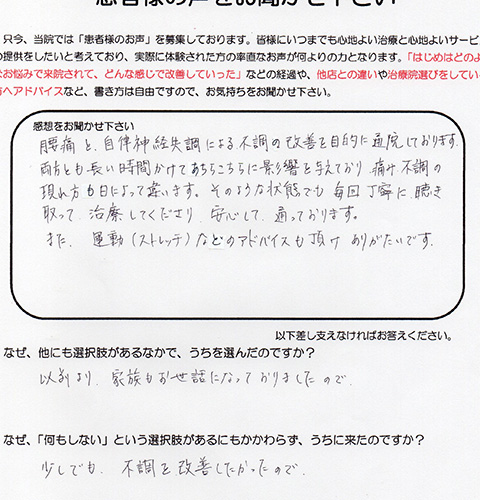 腰痛と自律神経失調による不調の改善を目的に通院しております。両方とも長い時間かけてあちらこちらに影響を与えており、痛み不調の現れ方も日によって違います。そのような状態でも毎回丁寧に聞き取って治療してくださり、安心して通っております。また、運動(ストレッチ)などのアドバイスも頂けてありがたいです。