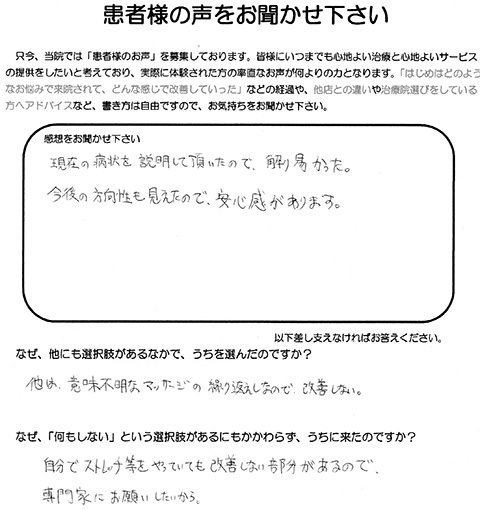 患者のは無しを十分に聞いていただくことで、治療方針を的確に示してくださいました。大変安心感がある治療、ありがとうございます。