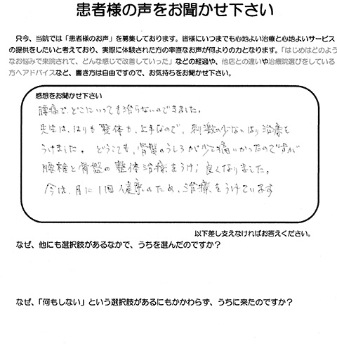 腰痛でどこに行っても治らないのできました。先生は、鍼も整体も上手なので刺激の少ない鍼治療を受けました。どうしても骨盤の後ろが少し痛かったのですが、腰椎と骨盤の整体治療を受け、良くなりました。今は月に1回健康の為、治療を受けています。
