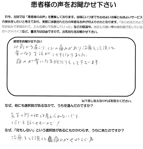 以前から肩こり、くびの痛みがあり治療をして頂くと、楽になり生活がしやすくなりました。痛みが楽になる施術をしてくださいます。